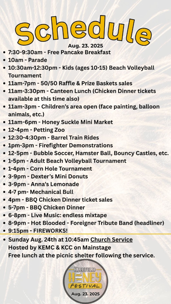 The Kleefeld Honey Festival is a beloved summer tradition celebrating over 50 years of community spirit in the “Land of Milk and Honey.” Held every August, the festival brings together locals and visitors for a full day of free family fun — starting with a delicious FREE pancake breakfast, followed by a lively parade, exciting games for all ages, local vendors, live music, and the famous BBQ chicken dinner. The day wraps up with an unforgettable fireworks display. Organized by volunteers and supported by sponsors, this event captures the energy and tradition of Kleefeld. Join us for the sweetest day of the year!
