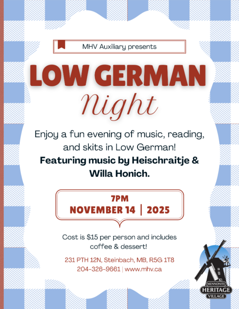 Enjoy a fun evening of music, reading, and skits in Low German! Featuring special music by Heischraitje & Willa Honich. Tickets are $15 (purchased at the door) and include coffee and dessert.