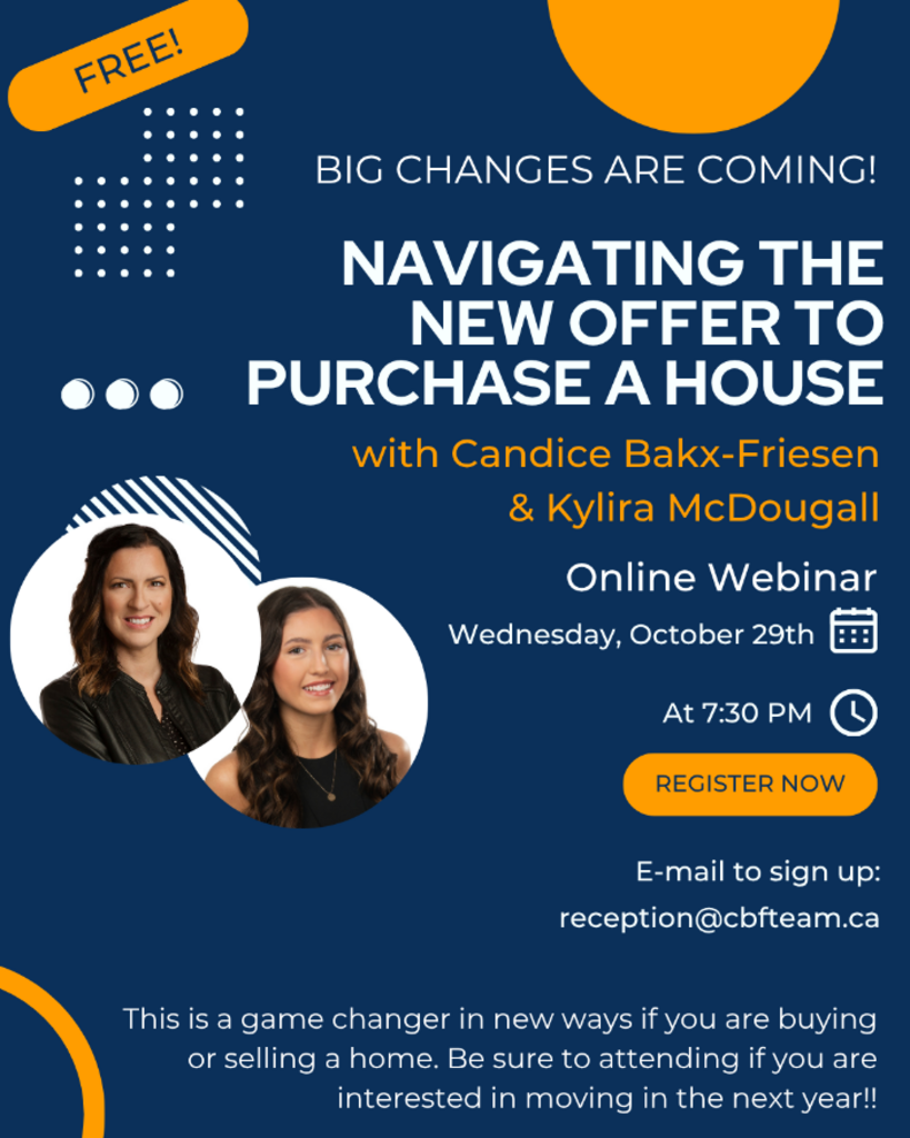 Join Candice Bakx-Friesen and Kylira McDougall for an informative and easy-to-follow webinar on Wednesday, October 29th at 7:30 PM as they break down everything you need to know about the new Offer to Purchase process.