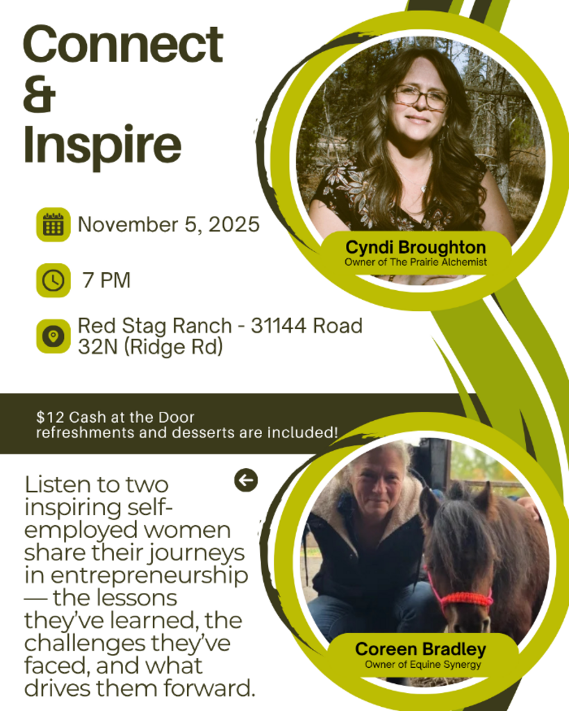 Hear from Cyndi Broughton, Owner of The Prairie Alchemist, and Coreen Bradley, Owner of Equine Synergy, as they share their personal journeys in entrepreneurship โ the lessons theyโve learned, the challenges theyโve faced, and what keeps them motivated to move forward.