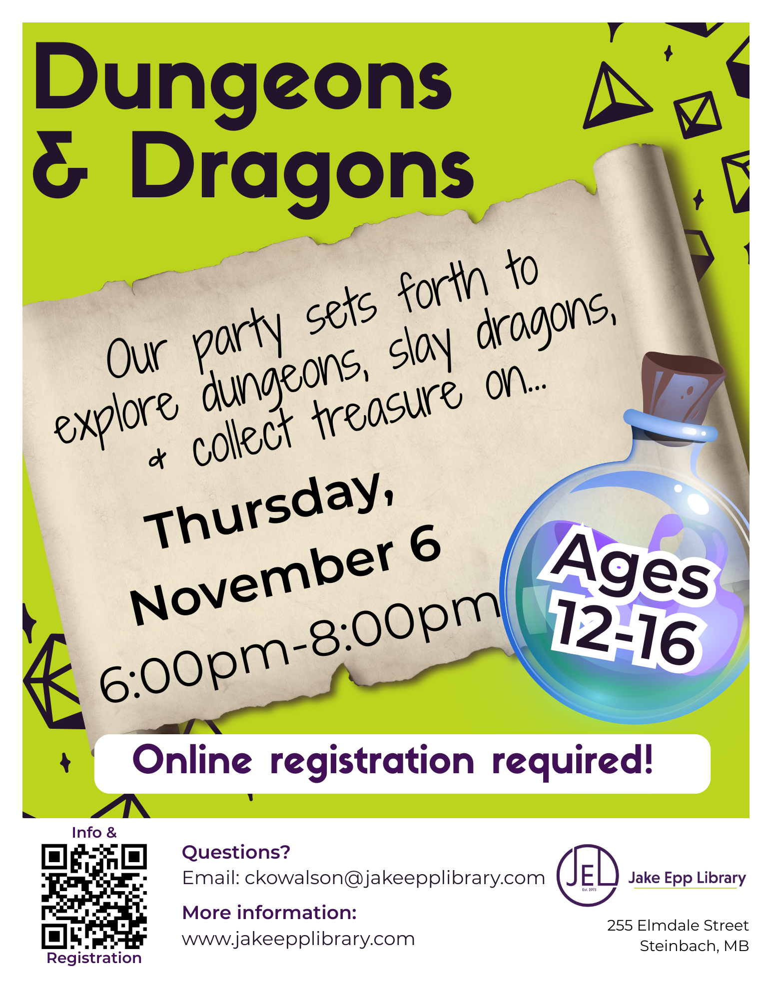 To register for this event, please go to https://jakeepplibrary.com/event/youth-dungeons-dragons-game-event-registration-required-2/ and Click to Register!