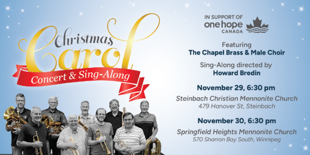 This special event features the One Hope Canada Christmas Choir (director Howard Bredin) and The Chapel Brass & Male Chorus (director Ralph Wegner). The evening also includes stories of God's work through One Hope Canada's Bible camps and community ministries in Manitoba and across the country.