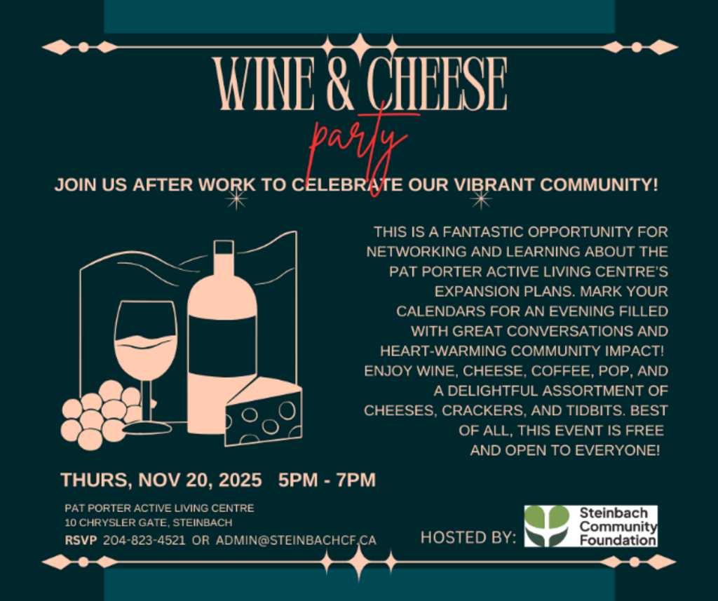 Join us after work for an exciting wine and cheese party as we celebrate our vibrant community! This is a fantastic opportunity for networking and learning about the Pat Porter Active Living Centre’s expansion plans. Mark your calendars for an evening filled with great conversations and heart-warming community impact! Enjoy wine, cheese, coffee, pop, and a delightful assortment of cheeses, crackers, and tidbits. Best of all, this event is FREE and open to everyone! Don’t miss out on this wonderful gathering!