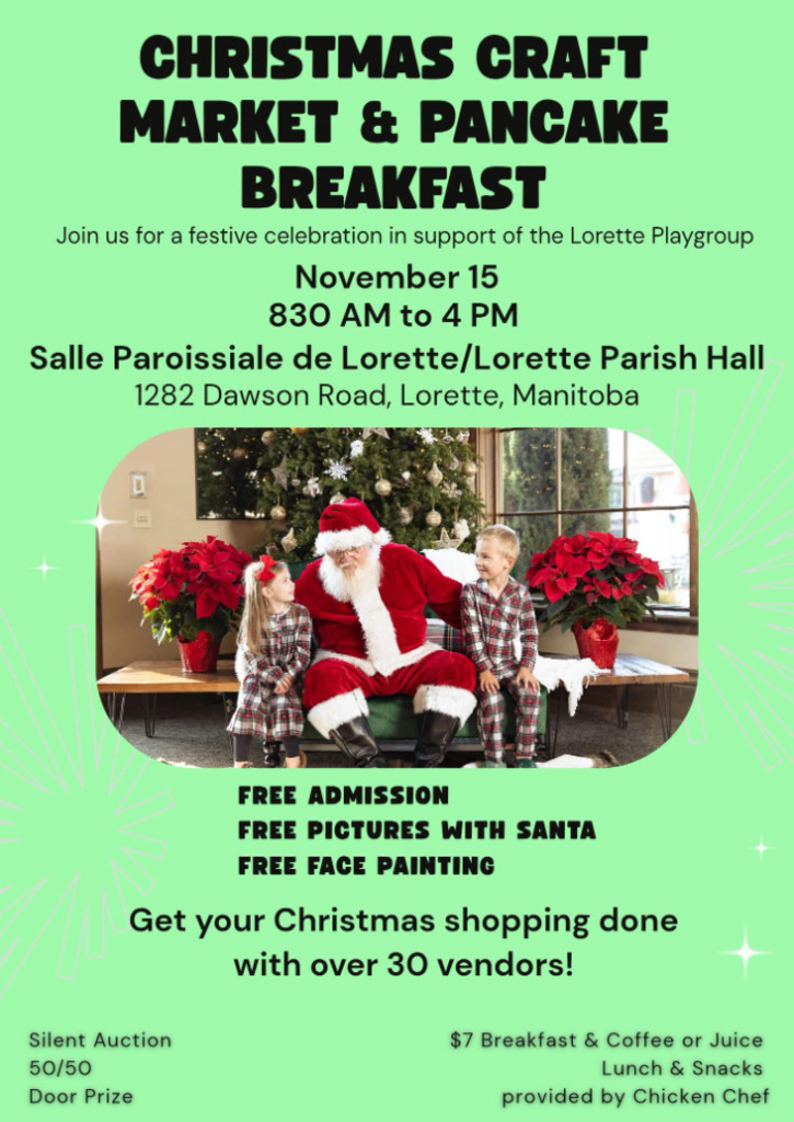 Join us for a festive celebration in support of the Lorette Playgroup. Free Admission. Free pictures with Santa. Free Face painting.