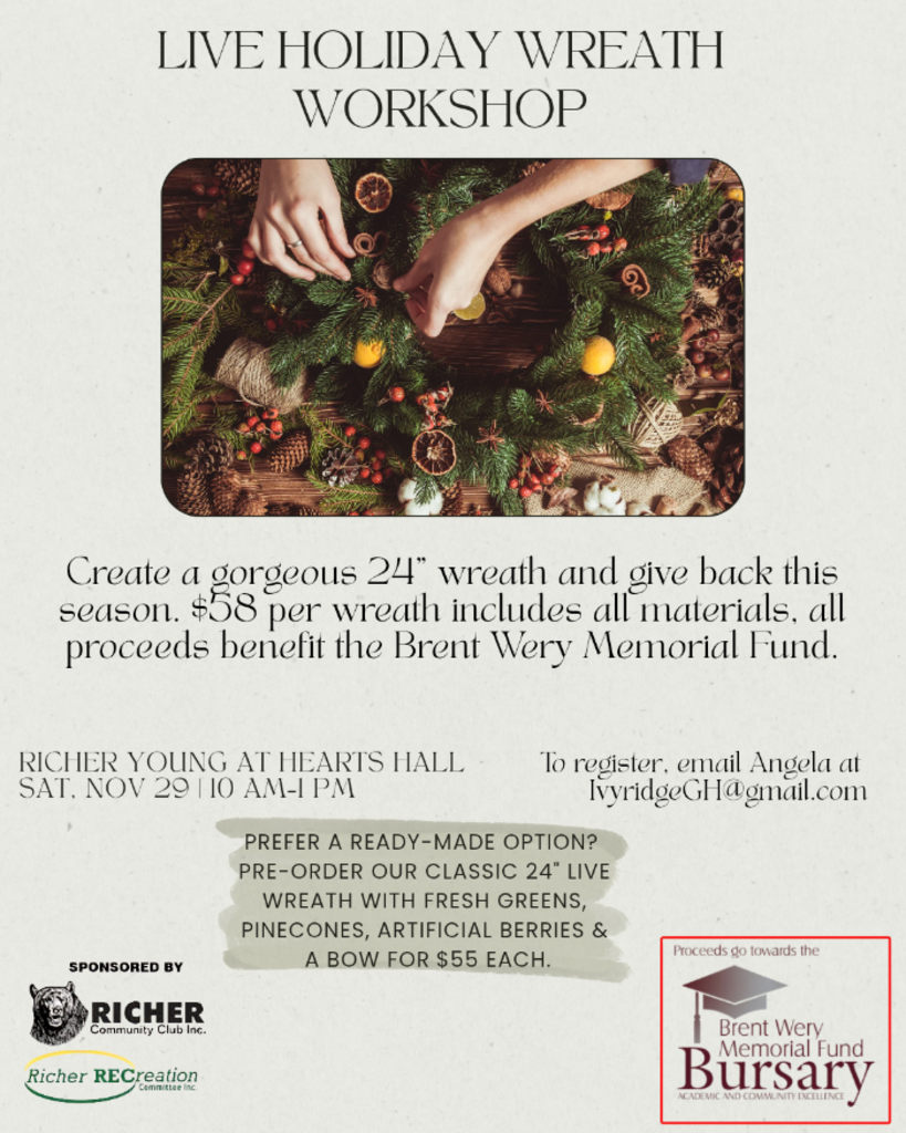 Everything you need to make and decorate your own beautiful 24" wreath will be provided. Proceeds go toward the Brent Wery Memorial Fund Bursary. We hope to see you there!