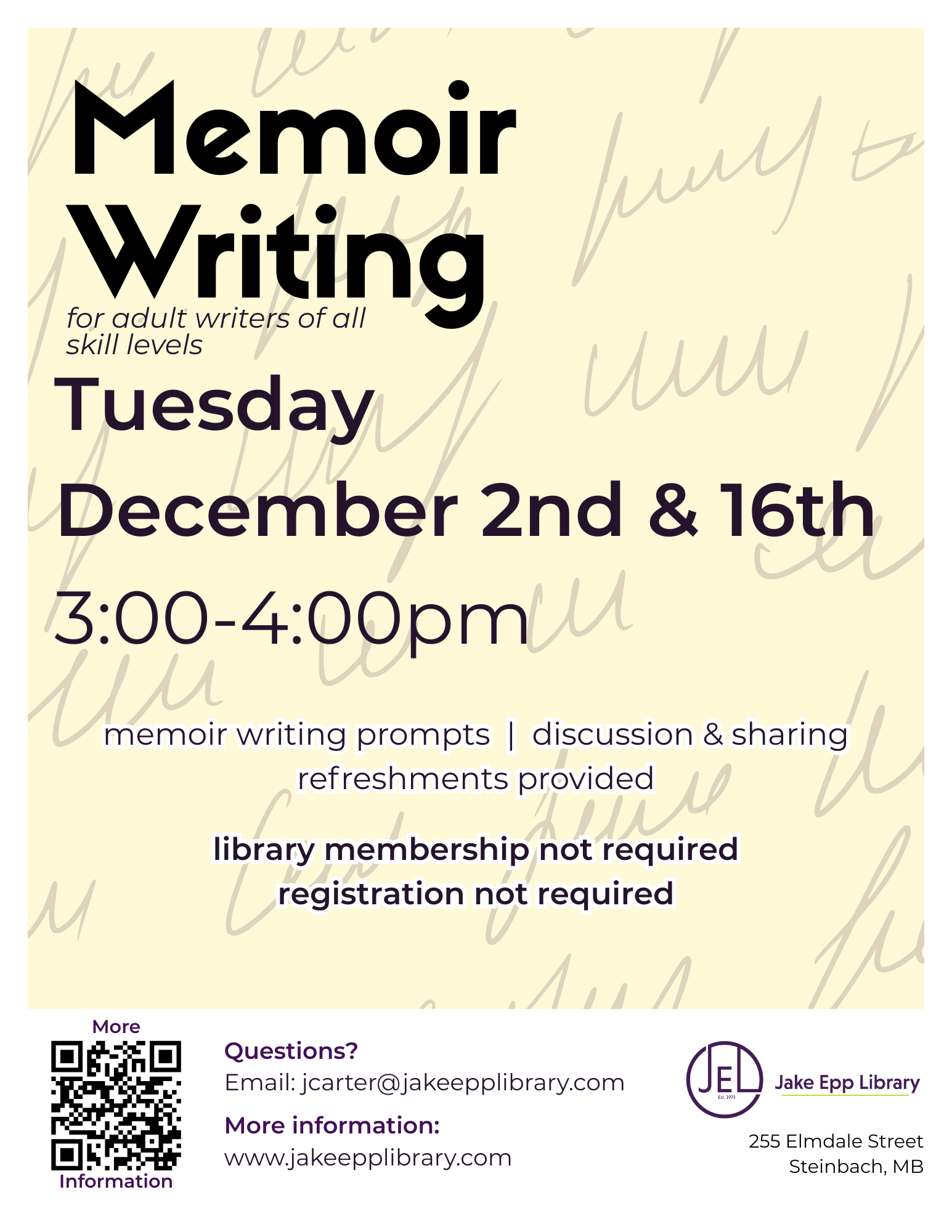 Event is free, a library membership is not required, and all programs are open to both Steinbach residents and non-residents.