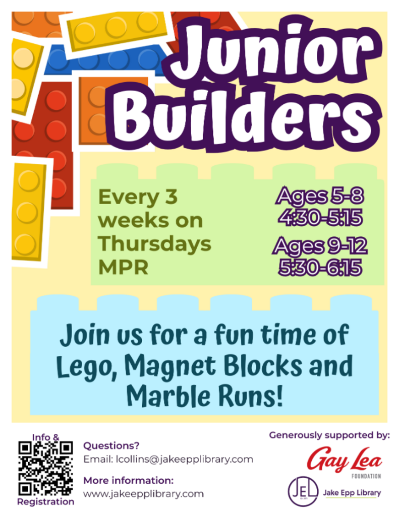 Join us every three weeks on Thursdays for Junior Builders. A hands-on program where kids can explore their creativity and problem-solving skills through building challenges and activities! We’ll use LEGO, magnet blocks, marble rungs and other materials to encourage imagination, teamwork, and fun.