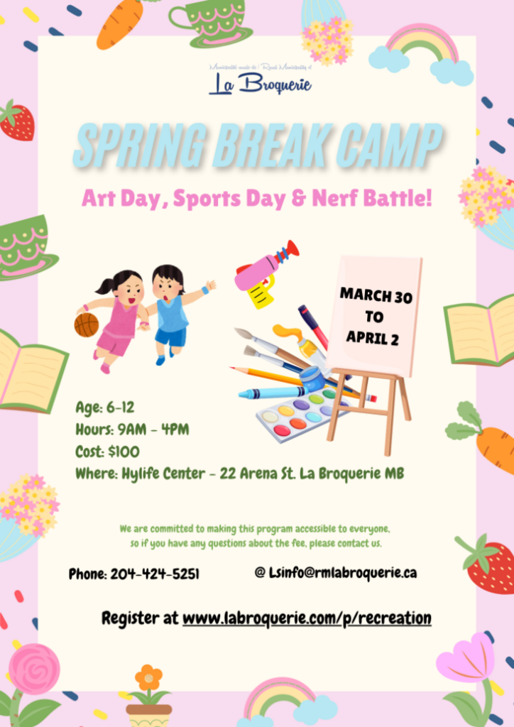 Looking for something fun during spring break? Join the R.M. of La Broquerie Leisure Services' Spring Break Camp for a week of exciting games, crafts, and activities. You can look forward to a Nerf Battle with Frontier Events, Art Day with Colleen Watchorn, skating, crafts, games and more!