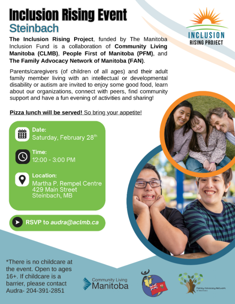 Parents/Caregivers (of children of all ages) and their adult family member living with an intellectual, developmental disability or Autism are invited to enjoy a pizza lunch, learn more about our organizations Community Living Manitoba, Family Advocacy Network of Manitoba and People First of Manitoba. This will be a casual event and a time to connect with peers, find community support and have fun!!!