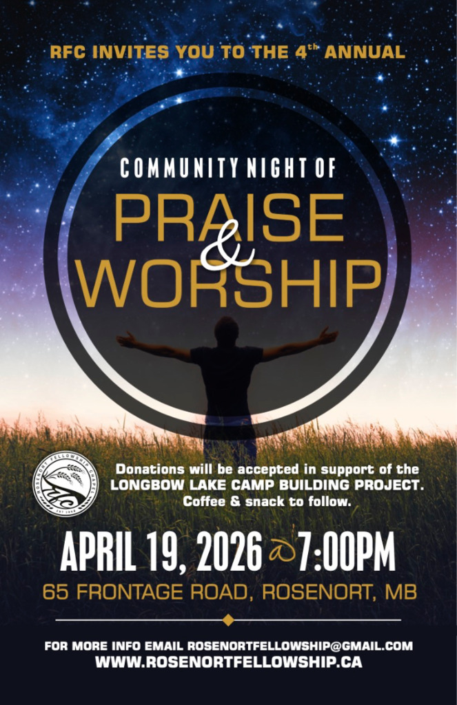 RFC invites you to the 4th Annual Community Night of Praise+Worship! Donations will be accepted in support of the Longbow Lake Camp Building Project. Coffee+Snack to follow